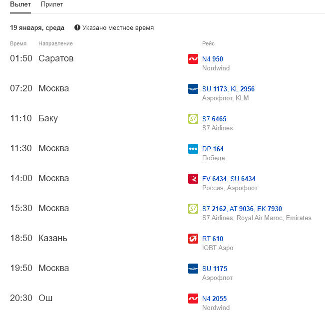 19 января 2022 Не силен в авиаперелетах, хотя общие представления об особенностях перелетов по всему миру имею. Вот, решил посмотреть, что происходит с зарубежными перелетами в режиме реального времени и расписания вылетов.. Для этого ввожу в поисковой строке браузера фразу с названием города и слова табло вылета, например "Астрахань табло вылета". Можно забить другой город и посмотреть его табло. И вот, уже есть чему удивиться по вылетам из Астрахани, город Ош, Киргизия - важный транспортный узел на пути в Таджикистан, Китай, Узбекистан (я был в этом городе в 2019). Также есть рейсы в Баку, Азербайджан, о них, конечно, слышал. О ценах пока не могу ничего сказать. Что еще удивляет в работе астраханского аэропорта? Например то, что 21 января и 28 января можно вылететь в Милан (Италия) Ого! Цены, конечно, кусаются, хотя.. это меня они кусают, а для кого-то это дневной заработок.. Однако, на табло вылета на 21 января Милана нет, потому что перелет этот в любом случае будет в