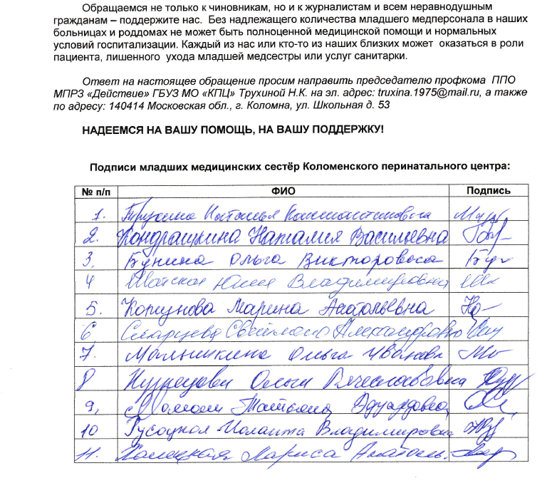 В Коломенском перинатальном центре вместо предусмотренных нормативами Минздрава 160 младших медсестер, работает всего 22 младшие медсестры, на которых свалили обязанности полностью сокращенных санитарок. По профстандартам это недопустимо. По словам медсестер, написавших открытое письмо правительству РФ, зарплата с 2019 года уменьшилась (тогда с совместительствами и премиями можно было заработать около 40 тысяч в месяц, теперь — не более 30-32 тысяч), а нагрузка на оставшийся после сокращения персонал увеличилась вдвое. Авторы открытого письма говорят о 12-часовой смене, в ходе которой приходится обслуживать одновременно 8 постов, без перерыва на обед.