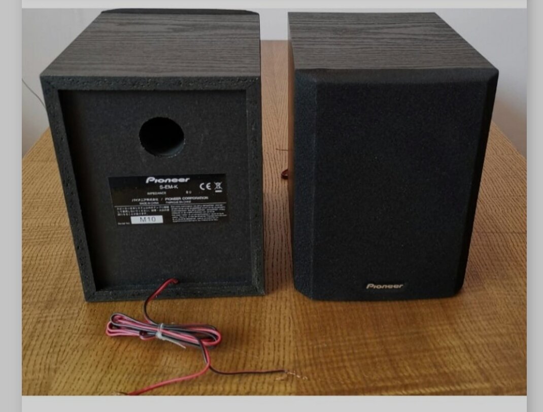 Полочная акустическая система Pioneer s-em-k Всем привет! Сегодня хочу рассказать про полочную акустику Pioneer s-em-k Что хочу сказать: во-первых информации про них в сети мало, особенно фотографий, смог найти один сайт на котором они продавались за 1500р пара, кстати фото выше взято от туда, так как у меня не комплект, а всего одна колонка во-вторых от чего они или от какой микро системы я так и не понял, напишите в комментариях если кто знает, ну а я расскажу то что удалось узнать)) Что хочу отметить: акустика фазоинверторного типа (круглая дырка в корпусе, здесь расположена в задней стенке)) Выполнена из ДСП примерно 1см толщиной и задней стенкой примерно 0.5см, не разборные, (но я попытался и разобрал на фото, а видео можно увидеть на моём Ютуб канале по ссылке https://youtu.be/RwzvVctnUoQ) акустический провод выходит прямо из корпуса и можно сказать встроенный Внутри установлен широкополосный динамик диаметром окола 10см, судя по характеристикам мощность 30вт на две колонки то е