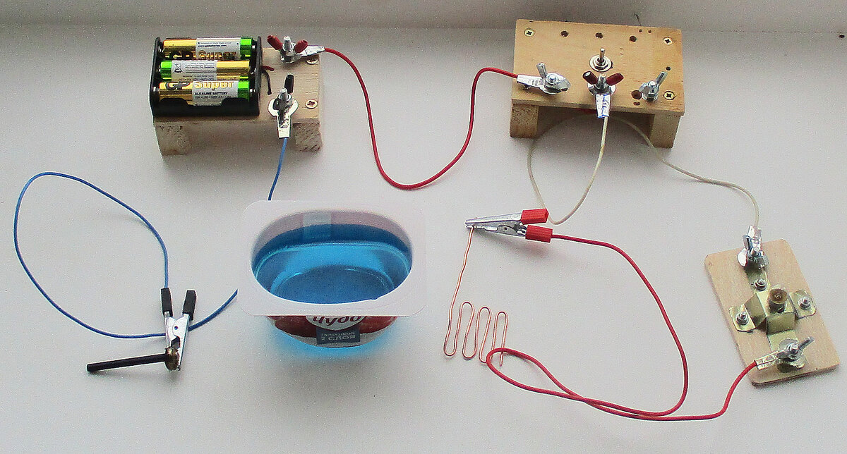 А теперь приступим к делу. Раствор нужен достаточно крепкий, так что сыпьте сернокислую соль меди не жалеючи. Перемешивать желательно неметаллическим предметом. А вот подогревать раствор для улучшения растворимости не надо - процесс ведется при обычных 20 градусах или около того. Электрическая цепь состоит из последовательно включенных источника питания, выключателя, амперметра (для чисто демонстрационного опыта не нужен), электролитической ванночки и лампочки накаливания. Лампочка убережет источник тока и амперметр в случае касания электродов в ванночке друг друга, да еще и отсигнализирует яркой вспышкой о замыкании. Кроме того, она ограничит силу тока, так что качество медного покрытия не ухудшится из-за чрезмерной плотности тока, и даже, благодаря своей нелинейности, будет немножко стабилизировать силу тока в цепи. Медные электроды проще всего сделать из сложенного гармошкой толстого одножильного медного электропровода.