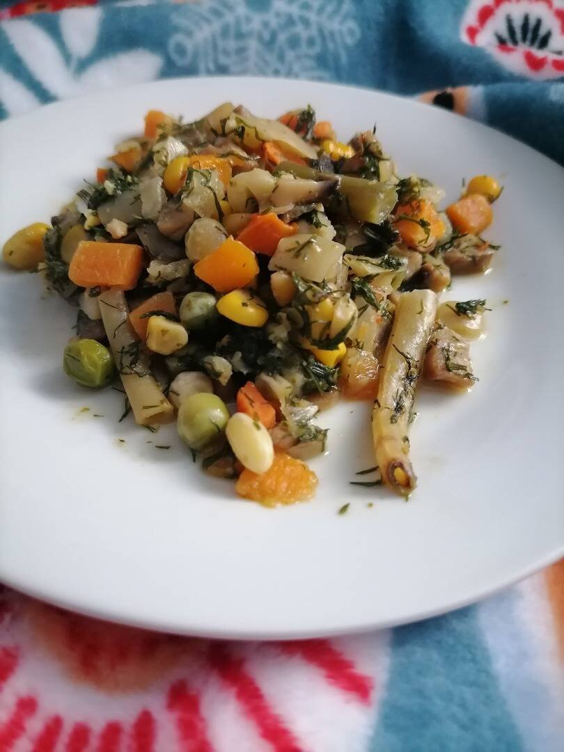 Ингредиенты: мексиканская овощная смесь, укроп, грибы шампиньоны, вода, соус песто, зелень Способ приготовления: Замороженные овощи и соус песто кидаем на сковороду. Ждём, когда они растают. Этим временем очищаем шампиньоны, убираем лишнее. Промываем. Шляпки режем кубиками, а ножки полукольцами. К овощам добавить грибы, перемешать. При необходимости можно использовать воду. Добавляем мелко нарезанную зелень. Перемешать. Дождаться готовности. Использовать в качестве основного блюда или гарнира. Приятного аппетита!