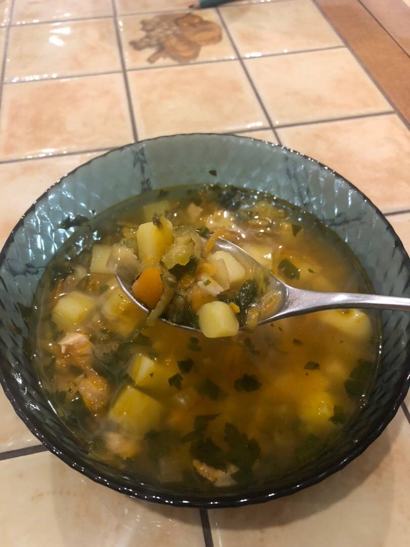 Вкусный горячий обед в зимнюю пору👍🏼 Ингредиенты: воды, Спинка от курицы, морковь, луковица, картофелины, сельдерея, небольших солёных огурца, томатной пасты, риса, рассола от огурцов, Петрушка, Лавровый лист, Соль, сахар, перец, Растительное масло Способ приготовления: В кастрюлю выложить куриную спинку, лавровый лист, сельдерей, залить водой, варить 30 минут. Посолить. Лук нарезать кубиками, обжарить до прозрачности, добавить морковь, натертую на крупной тёрке, жарить 5 минут, добавить томатную пасту, жарить 5 минут, добавить огурцы натёртые на крупной тёрке, готовить ещё пару минут. Посолить, поперчить, добавить чайную ложку с горкой сахара. Из бульона убрать спинку, отделить мясо, отправить в бульон, лавровый лист и сельдерей выкинуть. Картофель нарезать кубиком добавляем в бульон, варим до мягкости картофеля. Добавляем рис, варим 10 -15 минут, добавляем зажарку, варим ещё 5 минут. Далее вливаем рассол, даём закипеть, посыпаем зеленью. Приятного аппетита 🌸