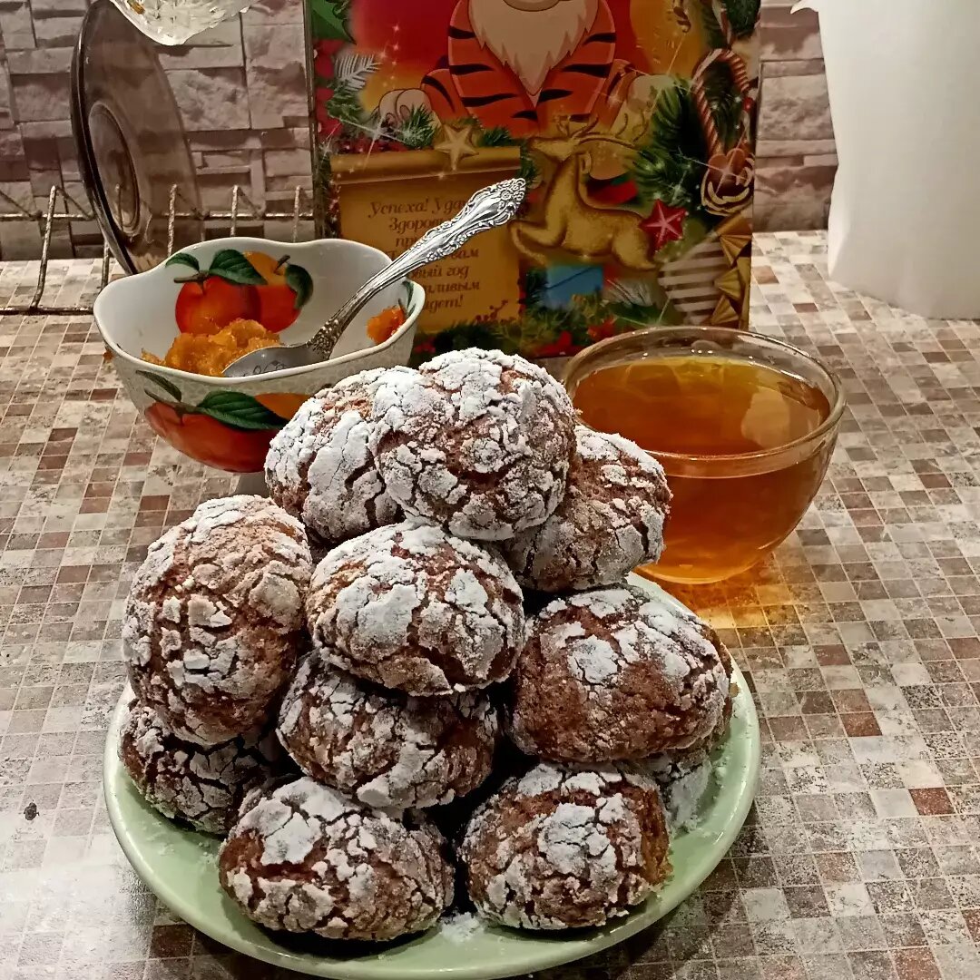 Печенье получается и красивым, и вкусным. Кисель для вкуса и цвета. Можно без него, но тогда добавить то же количество крахмала; муки. Ингредиенты: яйцо, молока, сливочного масла, какао, красного красителя (у меня сок свеклы 1 ст.л), ц/з муки, Подсластитель , быстрорастворимого ягодного киселя, Сахарная пудра для обсыпки Способ приготовления: Соединить все сухие ингредиенты. Добавить масло, перетереть. Смешать яйца с молоком и красителем. Влить в муку, вымесить до однородного состояния. Тесто липкое. Тесто заворачиваем в пленку и в холодильник на 2 часа. Можно на ночь, а утром печь. Достаем охлажденное тесто, отщипываем кусочки и формируем шарики. Обваливаем каждый шарик в сахарной пудре, чем больше ее будет, тем красивее трещинки получатся. Печем в разогретой духовке при 189° 12-15 минут.