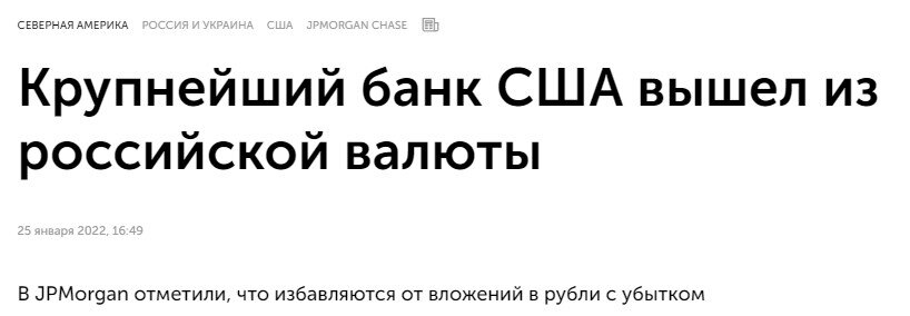 Крупнейший инвестиционный банк США и один из крупнейших банков мира сообщил, что полностью продал все принадлежащие ему рублевые активы. Под управление JPMorgan находится 2,6 трлн. долларов клиентских средств - это в 8 раз больше, чем годовой бюджет России на 2022 год. Банк также является одним из самых авторитетных финансовых аналитиков мира, к его прогнозам прислушиваются все. В начале 2021 года аналитики JPMorgan давали позитивный прогноз по рублю, считали его недооцененным, и прогнозировали, что к середине 2022 года рубль укрепится на 6,4% от тогдашних уровней (то есть, будет ниже 70 рублей за доллар). На фоне этого часть активов банк держал в рубле, поскольку на нем можно было получать хорошую по американским меркам доходность. Но уже с середины 2021 года банк начал постепенно сокращать свои позиции в рубле, а сейчас, когда рубль опустился до 79 рублей за доллар, принял решение закрыть все рублевые позиции с убытком. Какую сумму активов продал банк и какой убыток при этом получил