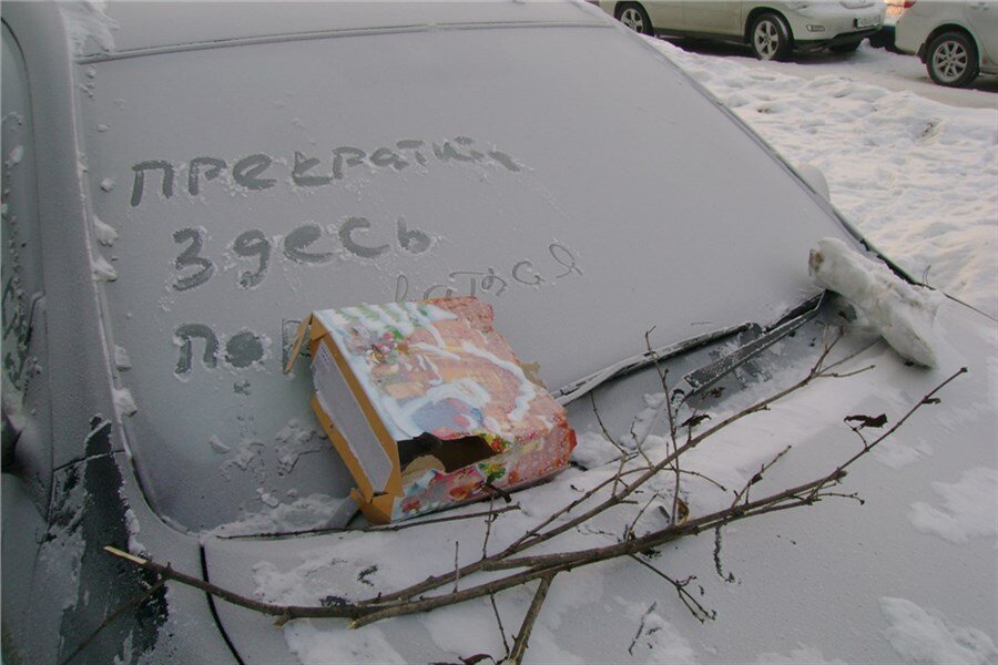 Значит, поставила я машину на ночь возле подъезда, а утром пошла пешком по делам. В этот момент и решила нагрянуть снегоуборочная техника. Мама, взволнованная этим событием, выглянула в окно и увидела, как на моей машине что-то пытается написать очень странная женщина (как выяснилось позже - "хозяйка" места, на котором переночевала моя ласточка).