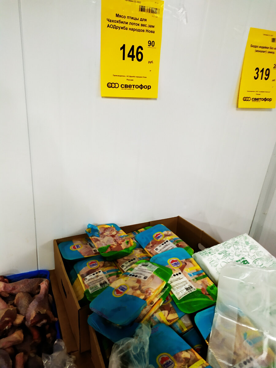 Я не зная, как обстоят дела в "Светофоре" других городов, но в нашем ценники на многие товары остаются очень низкими. И я даже сравнивала для прикола с "Магнитом" и "Пятёрочкой", то им очень далеко даже с предлагаемыми скидками. В этом обзоре хочу поделиться с вами увиденными товарами и ценами, которые очень нравятся покупателям в нашем городе. И так, "Светофор" в городе Абинск. В лотке мясо птицы для чахохбили. Цена 146 рублей за 1 кг. Прекрасно подходит для соуса или супа. Мороженая куриная голень. Цена 158 рублей за 1 кг. Свежая свинина на кости со шкурой, новая поставка. Цена 158 рублей за 1 кг. Готовый полуфабрикат блинчиков с начинкой из клубники, массой 1 кг. Цена 86 рублей. Овощная смесь "Гавайская" с кукурузой морковкой и другими ингредиентами, в упаковке 1 кг. Цена 100 рублей. Лапша быстрого приготовления EURO EXPREES с ароматом курицы, массой 60 грамм. Цена 7 рублей. Мороженая рыба треска. Цена 263 рубля за 1 кг. Суп для варки со звёздочками Gallina Blanca, в пакете 62 грамм
