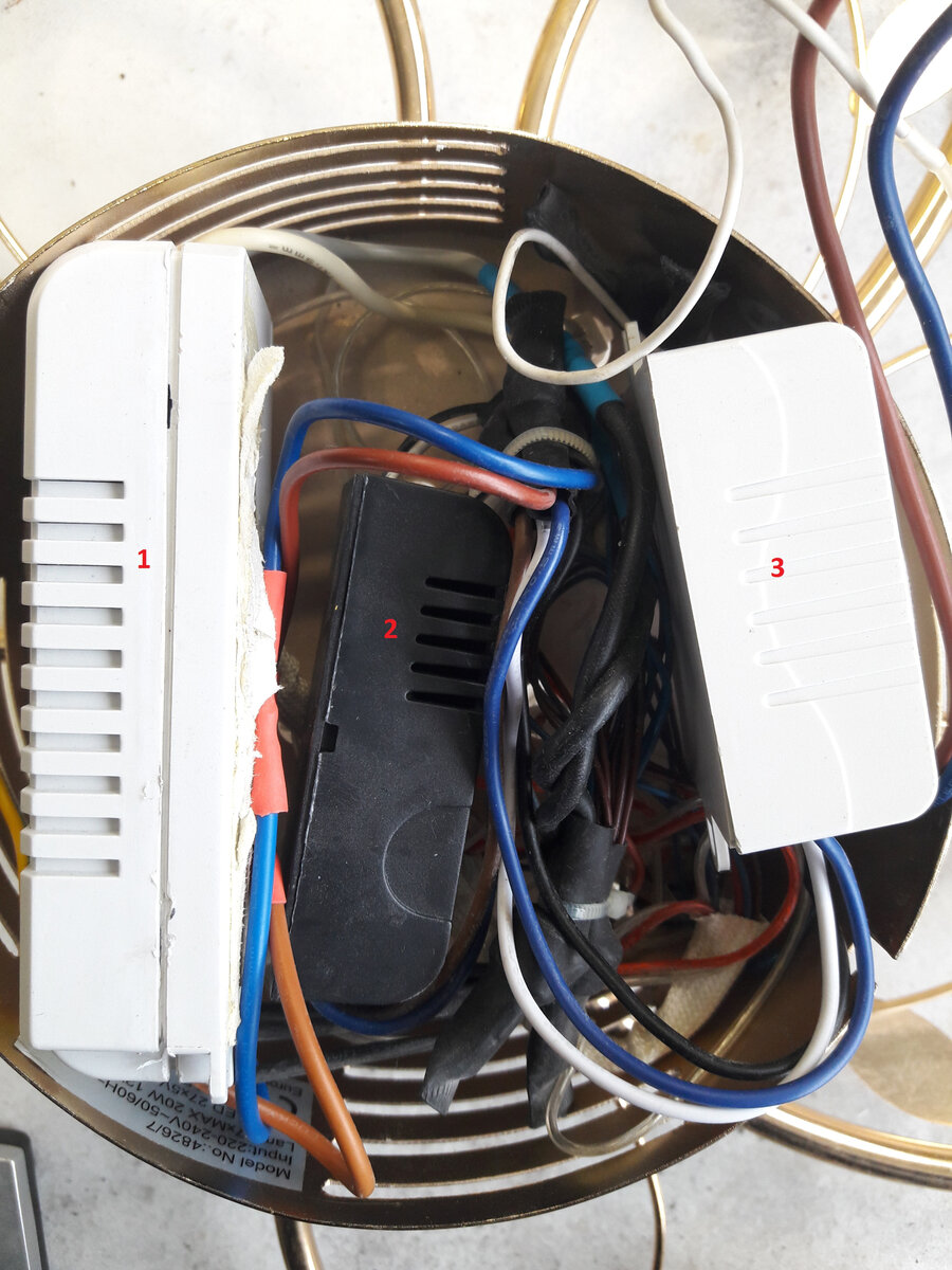 Всем здравствуйте! Сегодня мы ремонтировали люстру. Дожили :) Проблема со слов клиента - не включается. По факту оказалось что при подаче питания - 220 вольт, в модуле управления щёлкает реле , реакции на пульт нету, мигают светодиоды подсветки. Набор внутренностей в принципе типовой. 1- блок питания 12 вольт 160 ватт на лампочки. 2- блок питания светодиодной подсветки. 3- модуль управления и радиоканала. Частой , если не сказать типовой проблемой невключайки это именно модуль управления. А проблемой этих блоков бывают высохшие электролиты, и балластный конденсатор. Ну и здесь не обошлось без этого. Изначально, когда люстра щёлкала релюхой я решил проверить конечно электролитические конденсаторы. Тот который 470х16 вольт был таким. Второй на фото в зелёном кружке 220х16 вольт полностью в норме и даже esr был в норме = 0,3 Ом! Забыл сделать фото. После замены конденсатора реле щёлкать перестало, люстра заработала. Но при включении двух режимов сразу, люстра выключалась полностью. Н