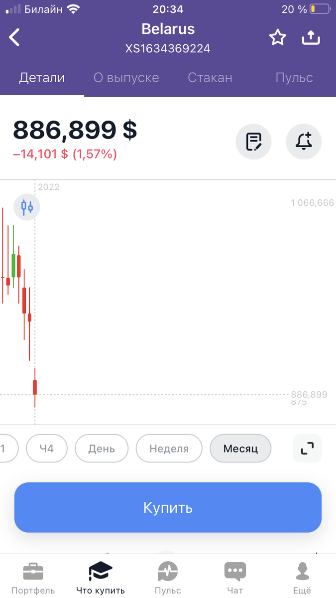 Всем привет! Давно я не писал статей, не было вдохновения. НО...Сегодняшний рынок акций и прочего фондового добра не дает мне покоя...и хочется поделиться идеями, где можно заработать пассивный доход, альтернативный вкладу. Все нижеописанное не является инвестиционной рекомендацией*!!! Наверное, заголовок впечатлил не всех,кто привык вкладываться в сомнительные проекты и брать на себя повышенные риски, но для обычного обывателя с консервативным настроем идея будет ТОПчик. Итак, перейдем к делу, точнее к моим наблюдениям и тому,что я докупил к себе в портфель (не является инвестиционной рекомендацией*!!!). Это долларовая облигация Беларуси XS1634369224 с датой погашения 29.06.2027 года. Чем привлекательна данная "папира", да тем,что за счет падения ее номинальной стоимости менее 900$ ее доходность к погашению составит те самые 10,75% годовых. Периодичность выплаты купонов 2 раза в год. Я инвестирую в горизонте 5 лет, поэтому данная бумага меня более,чем устраивает. Да, не забывайте,