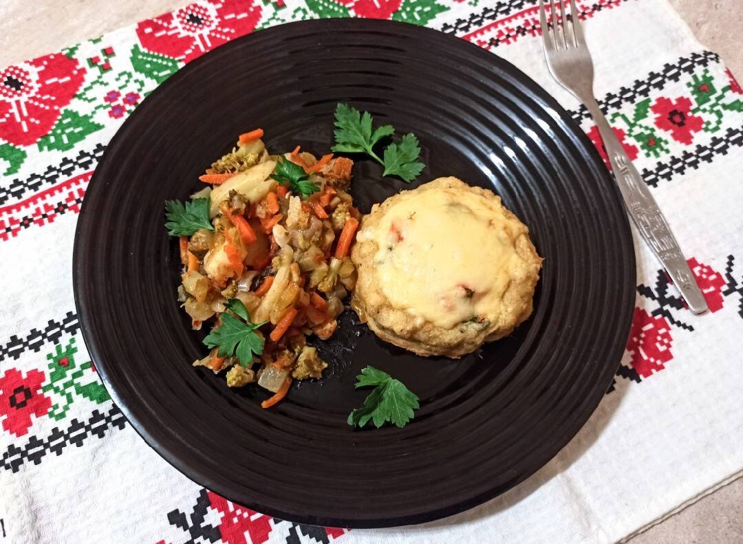 Один из способов очень вкусно приготовить рыбу. #кукпад4 Ингредиенты: фарша из рыбы (у меня хек), манки, небольших яйца, специи для рыбы без соли, соли, чёрного перца, сладкой паприки, Начинка:, помидор средний, вяленых помидора (по желанию), мягкого сыра, Зелень петрушки, укропа, соль, твёрдого сыра Способ приготовления: Рыбный фарш (я делала из филе хека, немного его отжав) смешать с солью, специями и манной крупой. Добавить яйца и ещё раз хорошо перемешать. Мелко порезать помидоры, покрошить зелень, добавить покрошенный мягкий сыр, немного подсолить и перемешать. Из фарша сформировать шесть круглых котлет, положить их на противень, застеленный бумагой для выпечки. Руками или с помощью дна стакана сделать углубления. Выложить в углубления начинку. Выпекать в разогретой до 180° духовке 20 минут. После этого достать из духовки, посыпать натёртым сыром и запечь ещё 1-2 минуты. Подать с любым гарниром. У меня тушёные овощи. Приятного аппетита и будьте здоровы 🌺