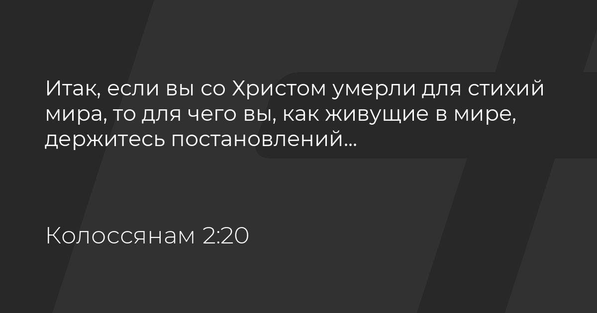 Павел не выражает сомнение в том, что они «со Христом умерли», а показывает, что происходит в результате того, что они стали участниками смерти Христа. Перемена в их подходе к жизни должна была наступить, когда они погреблись и воскресли с Христом в крещении (ст. 12). Итог — смерть «для стихий мира», за которой следует новая жизнь для Христа.