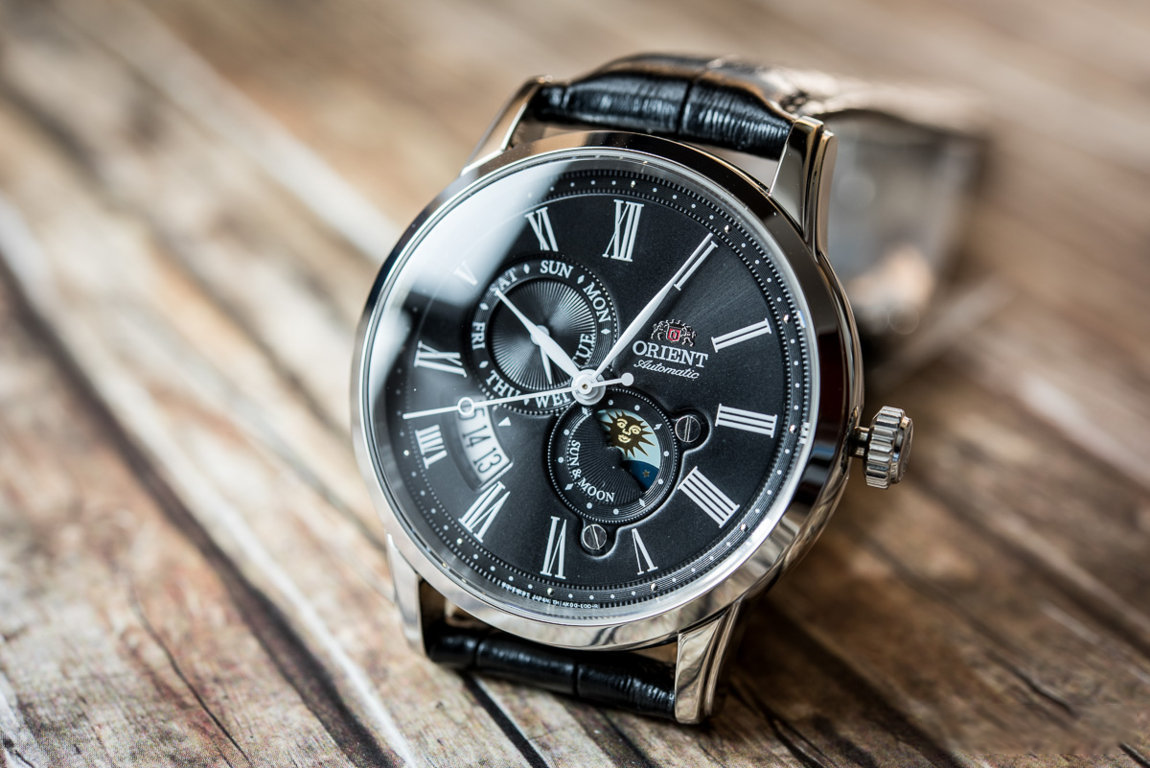 Также это единственная механика, представленная здесь. Калибр здесь стоит Orient 46B46 — это автоматическая механика с запасом хода 40 часов. Механизм точный и надежный. Помимо индикатора фаз тут имеется циферблат с днями недели и широкое окошко с датой. Видно вчерашнее, сегодняшнее и завтрашнее число. Удобно и смотрится стильно.