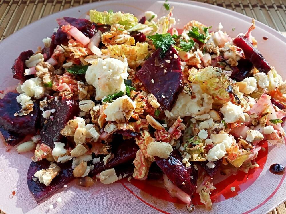 Вкусный, полезный завтрак. Сыр может быть любой мягкий - козий, овечий или коровий. Это может быть фета и адыгейский. Если сыр малосолёный, можно к заправке добавить соевый соус. Орешки тоже могут быть разными. Можно заменить их на семечки. Также и листья салата выбирайте на свой вкус. #завтрак Ингредиенты: Свёкла вареная, Капуста пекинская, Сыр овечий, Орехи кешью и грецкие, Масло растительное , Горчица , Сок лимона, Соус вьетнамский манго, Перец чёрный молотый, Тимьян листочки, Бальзамик соус, Петрушка Способ приготовления: Свёклу нарезать тонкими дольками. Капусту порезать поперек кочанчика широкой лапшой. Из половины лимона выжать сок. Интенсивно взбить его вилкой с маслом и горчицей в эмульсию. Добавить манговый остро- сладкий соус (можно заменить на сладкий чили), тимьян, чёрный молотый перец. Перемешать. Этой заправкой залить капусту со свёклой. Перемешать. Выложить заправленные капусту и свёклу на широкое блюдо. Посыпать дроблёнными орешками, крошкой из сыра, нарезанной петрушк