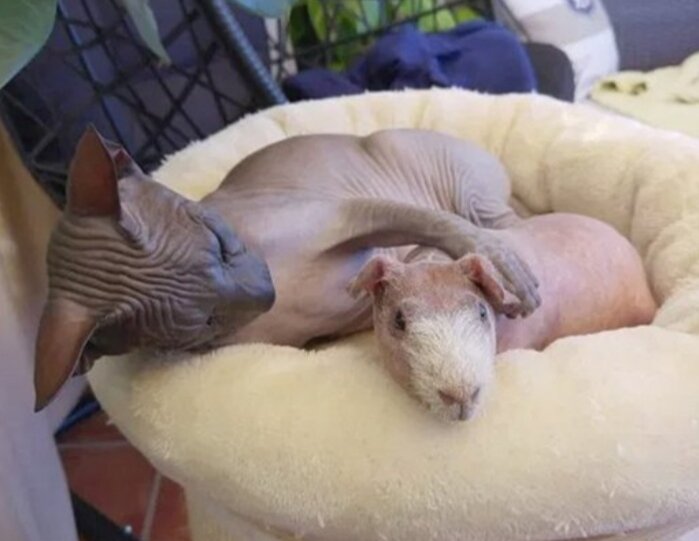 Теперь детеныш думает, что он кошка. У жительницы Эстепоне (Испания) Оксаны Балтакьене живут пять кошек-сфинксов. По словам Оксаны, представители этой породы очень умные и общительные кошки. Неудивительно, что они сразу же подружились с новым членом семьи — морской свинкой по имени Энтер Луис — и приняли его как своего. «Они думают, что он их брат», — делится Оксана. Поэтому каждый день Луиса можно найти в компании кошек. Луис обожает свою новую семью. Он постоянно проводит время рядом со сфинксами — и очень любит с ними обниматься. Такая теплая связь между питомцами, как говорит Оксана, принесла в ее дом много позитивных эмоций.