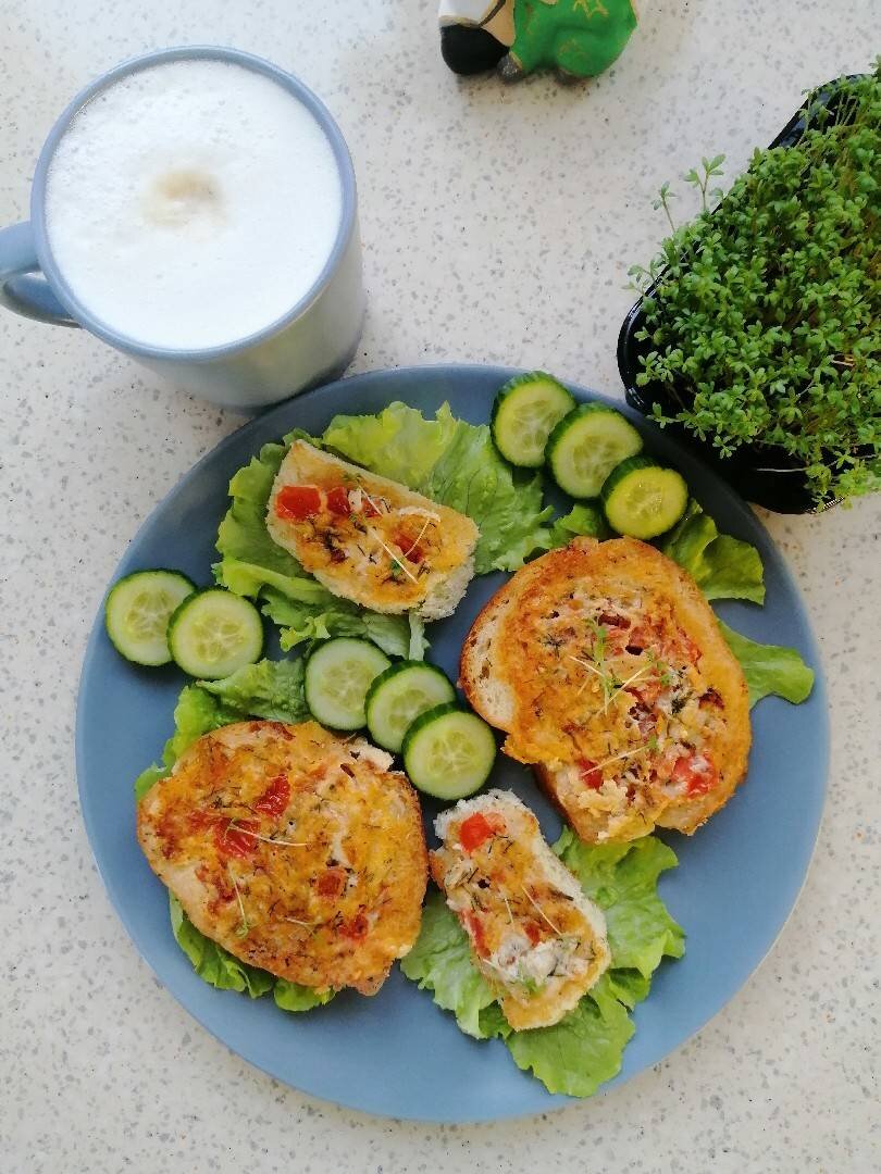 #завтрак Это быстро и вкусно! Ингредиенты: ломтя батона 🥖, куриная грудка 🍗 отварная, томат маленький 🍅, сыр 🧀, укроп 🥬, яйцо 🥚, соль 🧂, перец 🌶️ - по вкусу, молоко 🥛 Способ приготовления: Нарезать отварную грудку и томат. Сыр натереть на тёрке. В миске соединить яйцо, молоко, укроп (у меня был замороженный), туда же добавить нарезанные грудку, томат и сыр. Соль, перец по вкусу и всё хорошо перемешать. Начинка готова. В кусочках батона вырезать мякоть. Кругляши обжарить на капле масла сначала с одной стороны, затем перевернуть и заполнить начинкой. Саму мякоть от батона я тоже использую в дело, обжариваю и кладу сверху начинку. Огонь средний, можно накрыть крышкой и готовить до готовности. Дополняем наш полезный завтрак овощами и зеленью - всем приятного аппетита 🤗!