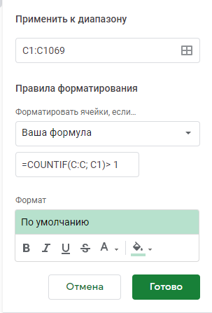 Собственно в таблицах эксель это все делается через форматирование, даже отдельная кнопка есть. А вот в гугл таблицах почему-то нужно пользоваться формулами. В попытках вспомнить нужную, перерыл весь интернет и везде поголовно вижу следующее: = COUNTIF(C:C, C1)> 1 Сломал все свои десять голов, пока пытался понять в чем проблема... Что нужно сделать, чтобы выделить повторяющиеся значения в google sheets: 1. Выделяем столбец или ячейки, которые нужно проверить; 2. Идем в условное форматирование, своя формула; 3. Там вставляем эту формулу = COUNTIF(C:C, C1)> 1 4. Понимаем, что ничего не работает; 5. Проклинаем людей, которые копируют статьи друг с друга с ошибкой; 6. Вставляем правильную формулу =COUNTIF(C:C; C1)> 1 Допускаю, что раньше гугл мог воспринимать запятые вместо точек с запятой, но все же. Что касается того, как это работает: C:C - это ваш интервал ячеек, который нужно проверить, у каждого свое; С1 - первая ячейка с которой идет проверка; COUNTIF - формула, которая проверяет