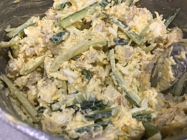 5. Все помещаем. Чуть-чуть посолить и добавить майонез. Тщательно перемешать все ингредиенты. Вкусный салат готов!