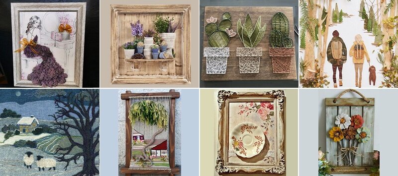 Вашему вниманию очередная подборка красивых идей для создания картин и панно из материалов, которые несложно достать! Первая статья из этой серии называлась 25 примеров оригинальных картин из бюджетных материалов. Если вы ее не читали, то можете перейти на нее, кликнув по названию мышкой или коснувшись названия статьи на сенсорном экране. Стринг Арт Так называется искусство плетения сюжетов из вязальной пряжи или ниток «Ирис» на металлических гвоздях, вбиваемых в панно из досок или фанеры. На YouTube можно найти довольно много видео, наглядно показывающих, как набивать гвозди, окрашивать доски, под какими углами натягивать нити, как вводить другой цвет. Декупаж Если у вас есть красивая рама и «старинная» тарелочка, остается только создать фон, воспользовавшись салфеткой и техникой декупаж. Ошибана Кропотливая техника создания картин из высушенных частей растений. Искусство родом из Японии. Как засушить растения с минимальной потерей цвета и формы? Освоить эту технику поможет книга пров