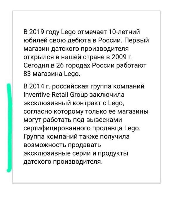 И вот уже в этом сообщении мы видим указание на заключенный в 2014 году эксклюзивный контракт с компанией The LEGO Group, участником которого с российской стороны была группа компаний Inventive Retail Group, не имеющая прямого отношения к компании LEGO. А стало быть уже только это говорит о том, что «Мир Кубиков» и The LEGO Group являются партнерами, но не более того.