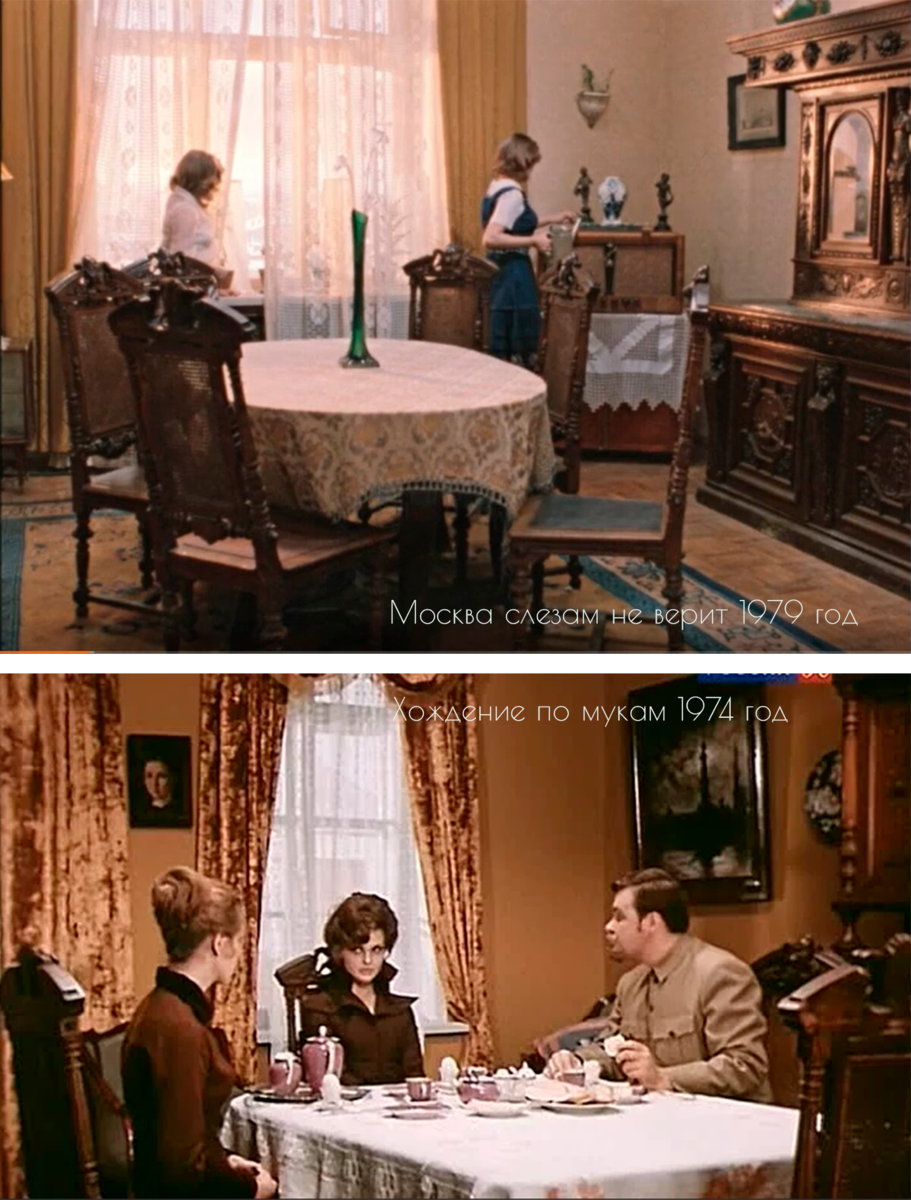 Достаточно было только внимательно присмотреться к деталям, и сразу стало понятно, что роднит фильм "Москва слезам не верит" и "Хождение по мукам". Стулья! Художники-постановщики использовали один и тот же реквизит. Заметьте, что стулья одни и те же. Возможно и стол тот же, но под скатертью его не видно. А вот буфеты явно различаются. Поражалась, отчего же квартира профессора Тихомирова в фильме "Москва слезам не верит" похожа на жилье антиквара: резная мебель, массивный дубовый стол, буфеты, один из них явно европейского происхождения, а вот второй выполнен в псевдорусском стиле. Но стало понятно, что художники набирали мебель среди реквизита Мосфильма и явно зашли в раздел исторического кино. Читайте далее и узнаете, какой самый востребованный реквизит, в фильмографии которого 8 картин, не у каждого актера такой список Кстати, даже в современной квартире Катерины нашлось место для старинных стульев и диванчика в стиле чипэндейла. Они так диссонируют с обстановкой, что поневоле пр