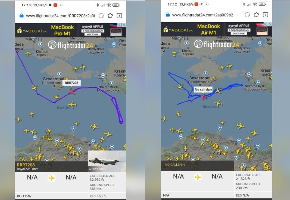 Как сообщают, это были: британский борт радиоразведки RC-135W, американский борт разведки и управления боем Boeing E-8C и борт неустановленной принадлежности без позывных.