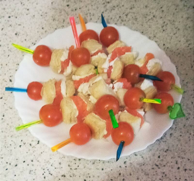 Ингредиенты: слоёного теста, Творожный сыр, Красной рыбы солёной, Черри Способ приготовления: Половина теста выпекаем на противне, не раскатывая. Нарезаем на квадратики. Каждый квадрат смазать творожным сыром, положить рыбку, нарезанную квадратиками, сверху накрыть, смазанным слоёным квадратиком, закрепит шпажкой с черри. Оригинальная закуска готова!