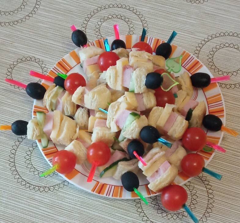 Начинка может быть любая. Ингредиенты: слоёного теста, ветчины или копчёная колбаса, огурец, Сыра любого, Маслины и черри Способ приготовления: Пласт слоёного теста не раскатывая запечь в духовке до золотистого цвета. Нарезать на маленькие квадратики. Ингредиенты также нарезать на квадратики. Прослаивать: тесто, сыр, ветчина, огурец, тесто, черри или маслина.