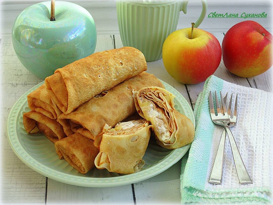 Блинчики можете испечь по вашему любимому рецепту, желательно тонкие. Ингредиенты: яйцо, сахара, соли, молока, муки, растительного масла, Готовим начинку, средних яблока, сахара, творога, сливочного масла, ванильного сахара, корица (по желанию) Способ приготовления: Смешать ингредиенты для блинчиков. Обязательно тесто должно перед выпечкой постоять не менее 30 мин. Выпечь блинчики. Яблоки очистить от сердцевины, нарезать мелко. Масло растопить на сковороде и выложить яблоки. Обжаривать минуты 3-5, слегка помешивая, на среднем огне. Когда яблоки станут полупрозрачными, добавить 1 ст.л. сахара и корицу, аккуратно перемешать. Обжарить все вместе пару минут, чтобы яблоки покрылись карамелью. Снять с огня, пусть остывают. Выложить творог в миску и тщательно растереть с 1 ст.л. сахара и ванильным сахаром. Смешать с остывшими яблоками. Начинка готова. Заворачиваем в блинчики и подаём к столу. Если любите с хрустящей корочкой, перед подачей обжарьте на сливочном масле.