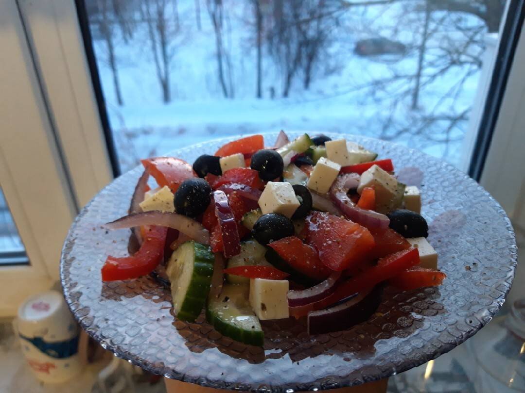 #ДомашнееЗадание Ингредиенты: помидора, огурца, болгарский перец, красная луковица, баночка оливок, сыр "Фета", орегано, соль, перец Способ приготовления: Помыть и подготовить свежие овощи. Огурцы нарезаем полукругами, а помидоры кубиками. Сладкий красный болгарский перец соломкой и лук полукольцами, маслины также маленькими колечками. Все хорошенько перемешиваем. Выкладываем салат в тарелку, можно слоями было готовить изначально тогда, у меня просто перемешанные овощи, так чаще всего готовят. Добавляем кубиками порезанный сыр "Фета" и целые оливки. Посолить и добавить орегано с перцем, чуть полить оливковым маслом. Приятного аппетита!!!