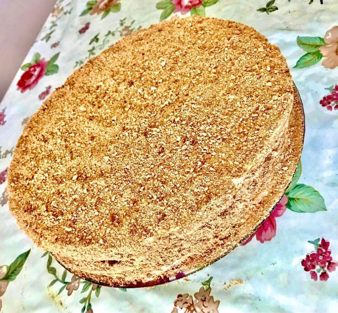 Ингредиенты: сливочного масла или маргарина, сахара, мёда, соды, муки, сгущёнки (1 банка - 370 гр, 3 банки - 1.110), яиц, сливочного масла (! не маргарин !) Способ приготовления: (Тесто) В кастрюле растопить 150 гр сливочного масла или маргарина, 3 столовой ложки мёда и 200 гр сахара, варить на медленном огне до кипения при этом, не переставая мешать, далее добавить 1 чайную ложку соды, тщательно перемешать. Снять с огня, когда цвет станет тёмно оранжевым. После остывания, добавить 3 яйца и перемешать до однородной массы, и постепенно добавлять +/- муку, пока не впитает, много муки не надо. Получившееся тесто делим на восемь частей, каждую катаем и вырезаем нужную форму. Выпекаем при температуре 180 градусов, 5 - 10 мин, каждые две минуты проверяйте (может подгореть), оставшиеся кусочки после вырезки тоже печём для обсыпки. (Крем) В кастрюлю вылить 740 гр сгущёнки, добавить 100 мл воды и 2 яйца. Хорошо все перемешать поставить на огонь. Варить до кипения, не переставая мешать. Снять с