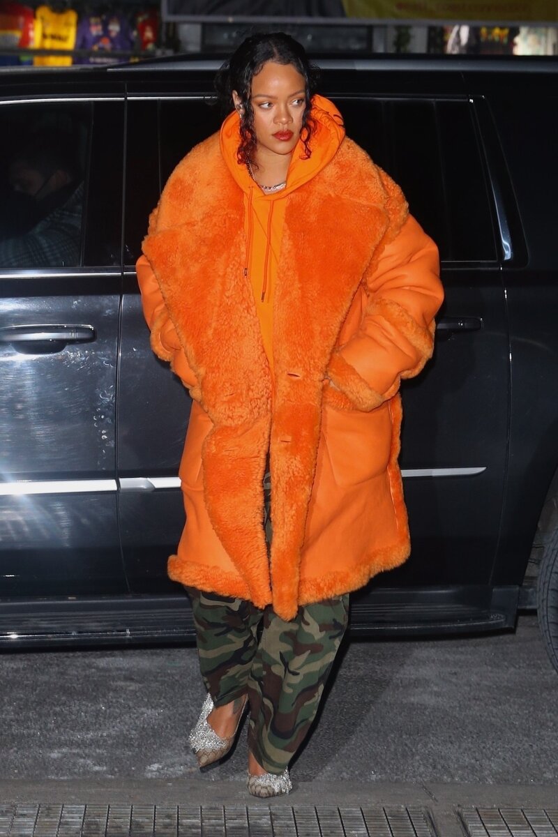 И все-таки оверсайз остается в абсолютных фаворитах Рианны, хотя в последнее время звезда все-таки тяготеет к более женственным аутфитам и намного чаще выгуливает облегающие фасоны. На днях певица в очередной раз заставила говорить о себе и о своем новом луке, отнести который к какому-то одному стилю крайне затруднительно. Рианна примерила ярко-оранжевую дубленку и худи в тон в сочетании с брюками в милитари-стиле и туфлями-лодочками. Лук завершили драгоценные украшения и небрежная прическа.
