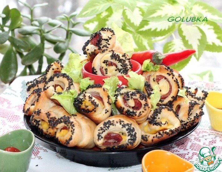 "Мини-пицца в конусе" - это идеальное решение для закуски. Быстро и вкусно! И вот такой букет с "пиццей", я предлагаю приготовить и подарить любимым мужчинам на 23 февраля. А кто не любит пиццу? Ингредиенты для «Закуска "Мини-пицца в конусе"»: Время приготовления: 40 минут Количество порций: 19 Рецепт «Закуска "Мини-пицца в конусе"»: 1. Очень тонко нарезать 19 кусочков колбасы. И разрезать каждую пластину сыра на 4 части. 2. Мягкое масло смешать с пикантной приправой. Приправу можно выбрать на свой вкус. 3. Немного припылить рабочую поверхность доски мукой. Раскатать размороженное слоеное тесто так, чтобы оно увеличилось в длину, в 2 раза. Вырезать круги с помощью формочки или стакана, диаметром немного больше чем кусочек колбасы. У меня кружок теста диаметром 7 см, кружок колбасы диаметром 5 см, разница в 2 см. Середину круга смазать сливочным маслом с приправой. 4. Положите на каждый круг лепешки по кусочку колбасы и по листику сыра (1/4 часть). Смажьте взбитым белком всю поверхность