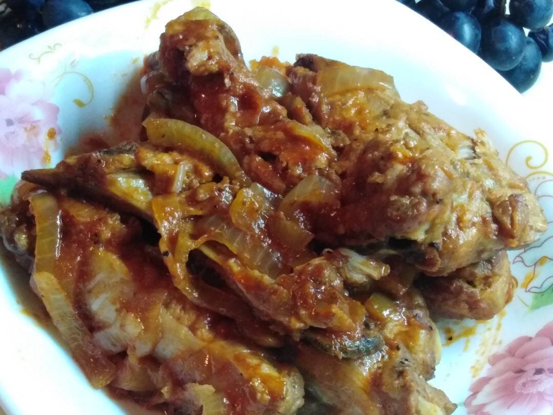 #кукпад4 Ингредиенты: ребра свиные , репчатый лук , томатная паста , соль , перец свежмолотый смесь , растительное масло Способ приготовления: Ребра припустить на растительном масле, чтобы слегка зазолотились. Посолить, добавить перец. На ребра выложить репчатый лук и томатную пасту. Убавить огонь до минимума, Накрыть крышкой и томить в течение 1 часа. Затем все перемешать. Оставить томиться ещё на 1 час. Через 30 минут перемешать. Приятного аппетита!!!