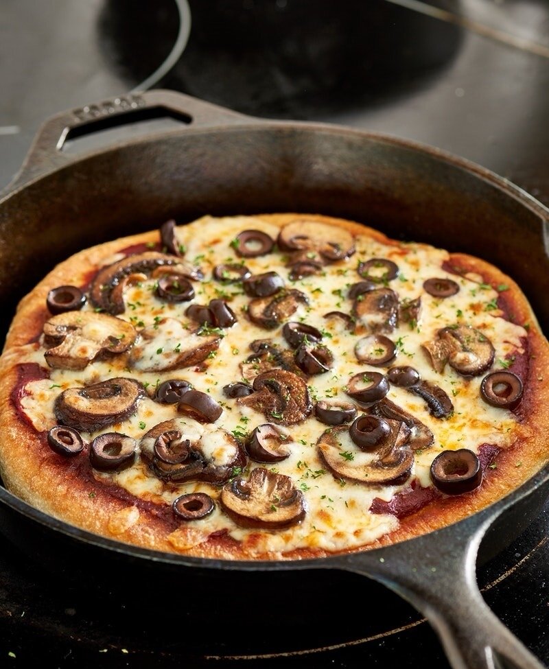 Пицца на сковородке - это очень вкусно! 🤩 Такая пицца получается очень вкусной, нежной, мягкой. В отличие от пиццы, приготовленной в духовке, тесто для пиццы на сковороде получается более тонким. Тесто для пиццы можно приготовить с любой начинкой, но сегодня я предлагаю приготовить пиццу с грибами и сыром. Вкусная пицца на сковороде - это отличный вариант для быстрого перекуса, или ужина. Для приготовления пиццы на сковородке нам потребуется: Для теста: - Мука – 150 гр. - Вода – 50 мл. - Сухие дрожжи – 1 ч.л. - Соль – 0,5 ч. л. - Сахар – 1 ст. л. 😋Для начинки: - Шампиньоны – 100 гр. - Моцарелла – 100 гр - Лук – 1 шт. - Маслины при желании 100 гр - Сметана – 3 ст.л. - Томатный соус 1 ст.л Приготовление: 1. В воде растворяем дрожжи и сахар. 2. Добавляем муку, соль и замешиваем тесто. 3. Накрываем тесто полотенцем и оставляем на 30 минут. 4. Пока тесто поднимается, нарезаем грибы и обжариваем их на оливковом масле. 5. Нарезаем лук полукольцами и добавляем его к грибам. 6.