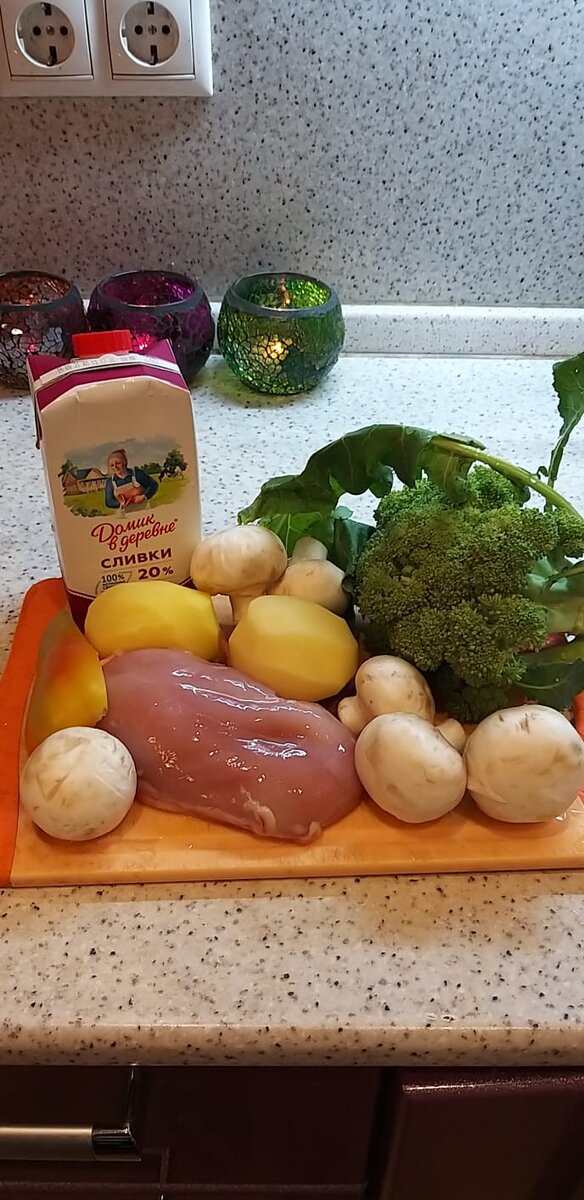День сегодня такой ленивый. И на готовку особенно силы тратить не хочется. Поэтому сегодня простой, вкусный и полезный обед - без хлопот. Нужна духовка и рукав. Так же нам понадобятся: Куриное филе (у меня половина грудки); Картофель (2 крупненьких); Брокколи (свежий качан, там примерно грамм 300 соцветий); Шампиньоны (грамм 150); Сливки 20%; Соль по вкусу, чеснок. Ваш овощной набор может отличаться, в зависимости от того, что есть в наличии в холодильнике. Вместо брокколи можно использовать обычную белокачанную капусту. Режем кубиками мясо и картофель. Брокколи делим на соцветия, шампиньоны режем вдоль, что б была узнаваема форма грибочка. Солим, добавляем любимые приправы. У меня немного чеснока. Складываем в рукав для запекания, заливаем сливками. Ставим в духовку на 200° на 30 минут. Вот тут внимательно: время приготовления может изменяться в зависимости от вашей духовки. Готовое блюдо посыпаем зеленью. Если есть сыр, то можно посыпать тертым сыром, тоже классно получится. При