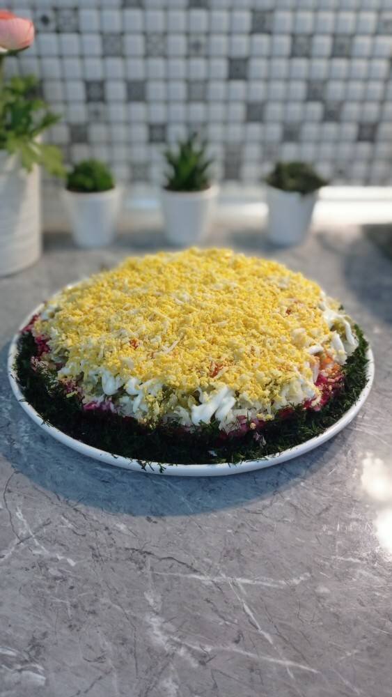 Ингредиенты: картошки, свекла, морковки, яиц, соленых огурцов, Майонез, Укроп Способ приготовления: Сварить все овощи по отдельности. Натереть на терке и собрать слоями. Каждый слой смазывать майонезом. У меня, картошка, свекла, огурцы, морковка и яйца.