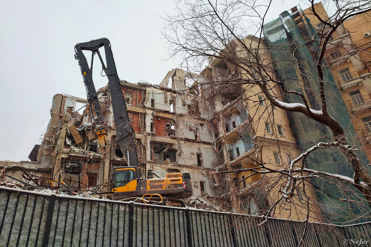Реконструкция здания. Запечатлела для истории. Это рядом со станцией метро Октябрьская. Недавно проходила мимо и не смогла пройти. Сделала несколько фотографий, но получилось плохо, стала снимать видео. Дядечка почему-то воспротивился и начал меня отгонять. Может волновался, чтобы меня не засыпало строительной пылью или случайно не зашибло обломками. Но я находилась за забором. Получается, ходить можно, а стоять нельзя. На следующий день пришла снова. Экскаваторы замерли, работы не производились. Может перерыв на обед, а может разрушение здания запланировано на вечер и ночь. Руины в сосульках, так как их поливают водой, чтобы прибить бетонную пыль. Однако, все равно она летит и ощущается в воздухе. Гостиница "Варшава" построена в 1960 году. Изначально это было отдельно стоящее здание. Примерно в 1989-1990 годах построен новый корпус Московского института стали и сплавов (МИСиС), который поглотил вестибюль станции метро Октябрьская и вплотную примкнул к гостинице. Визуально здание стало