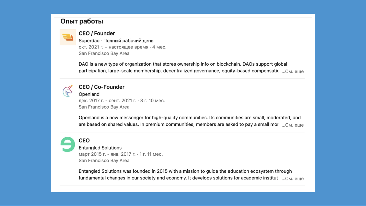 Как видим, никакого опыта в блокчейне или даже близких историях нет. Но зато есть закрытый OpenLand: “в августе 2018 года Openland привлёк $2,25 млн от Gagarin Capital, Y Combinator, фонда Soma Capital и других”.