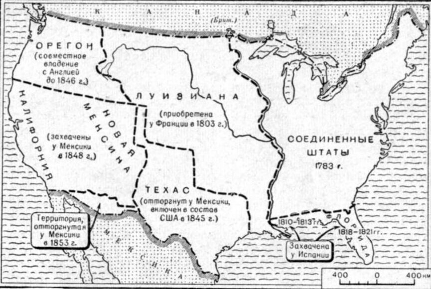 В 1845 г. США захватили обширную область Техас, которая по проискам рабовладельцев США еще ранее отделилась от Мексики. Продолжая захваты на юге, США в следующем, 1846 г. напали на соседнюю слабую Мексику и после двухлетней грабительской войны захватили громаднейшие области - Новую Мексику и Калифорнию.