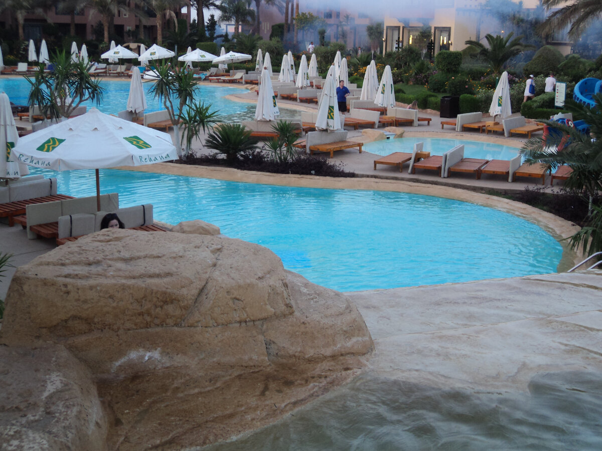 Добрый день, мои дорогие читатели! Сегодня, как я уже говорила, я не много расскажу вам про сам отель. Rehana Sharm Resort находится в районе Набк Бэй, в 20 км от центра развлечений Наама Бей и в 7 км от международного аэропорта Шарм-эль-Шейх. На территории комплекса расположены 4 ресторана A la Carte, 9 баров, основной ресторан Palmetto, СПА-центр Butterfly SPA, где в атмосфере роскоши и умиротворения гостей ждут различные виды массажей, сауна, парная, джакузи и конечно же турецкий хамам. Для тех, кто ведет здоровый образ жизни, предлагает множество возможностей для спорта и активного отдыха: пляжный волейбол, настольный и большой теннис. Каждый день на тенистых полянках велись йога, пилатес, уроки латино-американских танцев и уроки танца живота. А также водное поло, аква-аэробика, дартс. На фото - глубокий бассейн, где в основном плавали взрослые. Тут же находясь в бассейне вы можете подплыть к бару (на фото он круглый под крышей) и заказать себе коктейль. Бассейнов очень много,