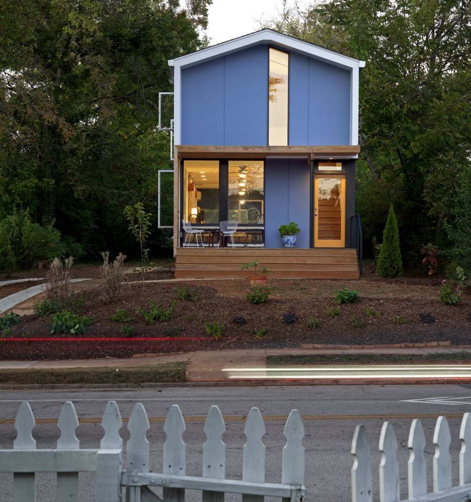 Дом находится в модном и растущем, но историческом районе, в нескольких кварталах к востоку от центра города Роли. Этот дом недорогой, небольшой, современный и городской. Продуманный план размещает входы, лестницу, коридор, кухню и половину ванной в одной стороне дома, открывая остальное пространство для проживания. Дом имеет эффективную оболочку и использует несколько устойчивых стратегий для сбора и сохранения энергии. Верхний этаж сдвинут в сторону задней части участка, чтобы создать жилое пространство двойной высоты на улице и крытую веранду, выходящую на задний двор. Общая стоимость строительства составила 1260 долларов за квадратный метр. Название: Резиденция Часен (Chasen Residence)