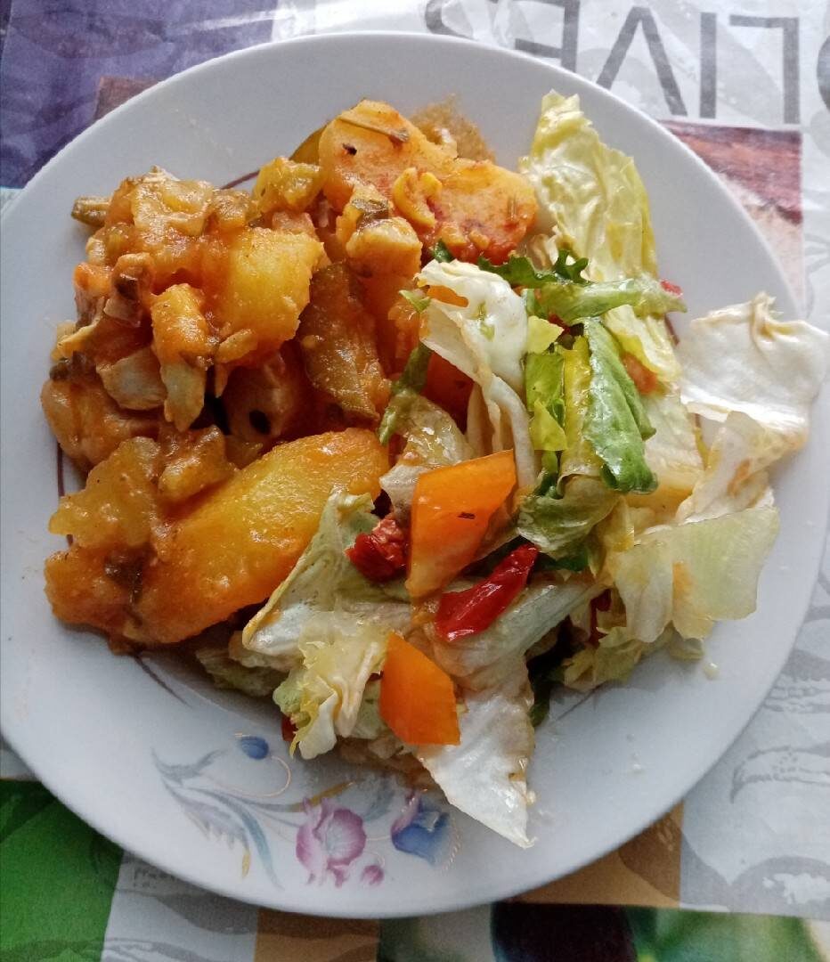 Ингредиенты: картофеля, куриного филе, луковицы, солёных огурца, томатной пасты, чеснока, Приправа, зелень, соль Способ приготовления: Картофель порезать дольками, промыть в холодной воде. Затем залить картофель кипятком, прикрыть крышкой на 3 мин,тогда картофель не разварится. Обжарить картофель до готовности, снять со сковороды. Затем обжарить филе курицы, добавив лук, когда лук подрумянится, добавить нарезанные соломкой огурцы и 1 ст л томатной пасты. Добавить половину стакана воды и тушить 5-7 мин в сковороде при закрытой.крышке. Затем добавляем обжаренную картофель и ещё тушим 5 мин. Выключить и добавить мелко порезанную зелень и чеснок. Подаём со свежим салатом.