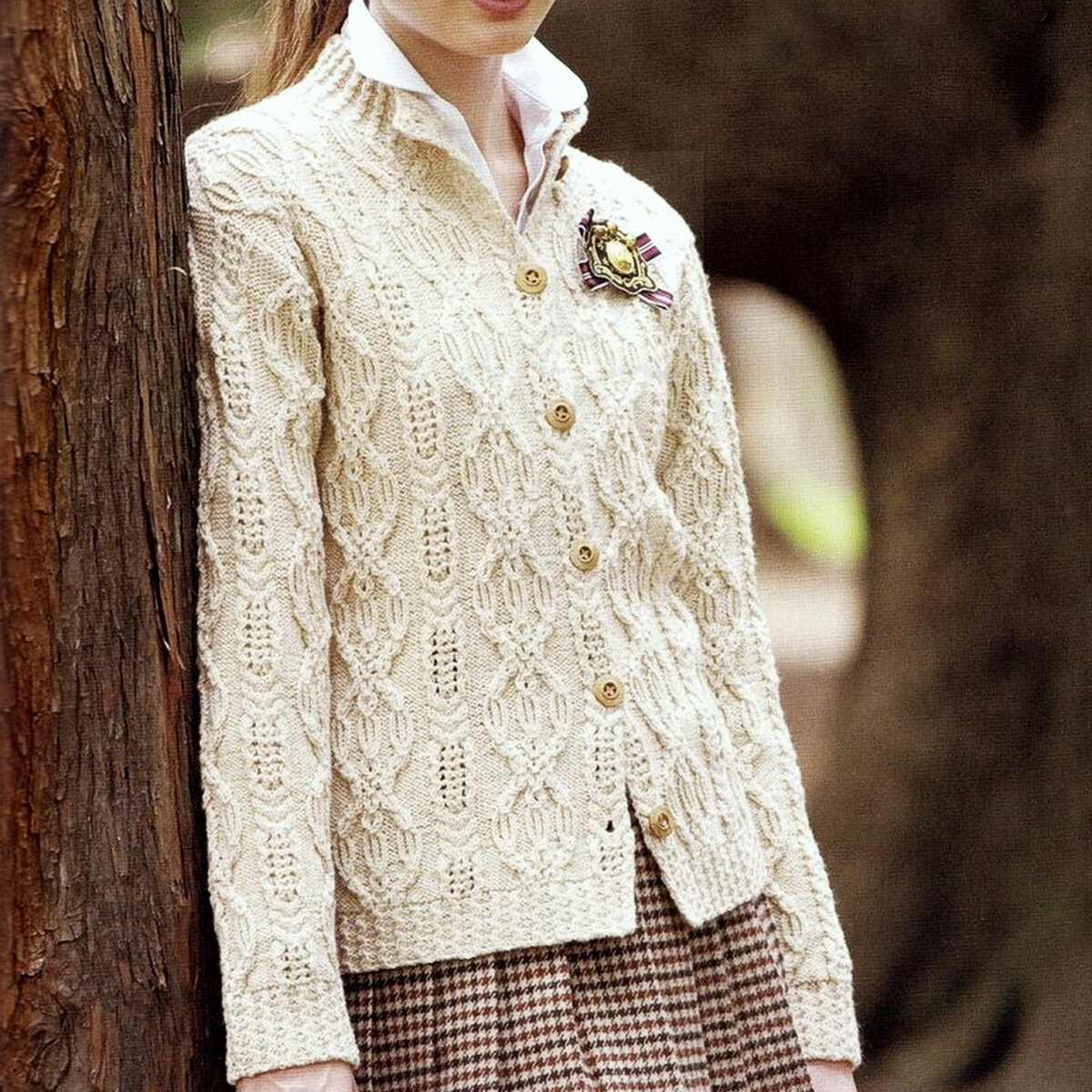 Бесподобный жакет цвета «экрю» с воротником-стоечкой, необычной ажурной резинкой и, надо признать, сложным и многогранным рельефным узором.