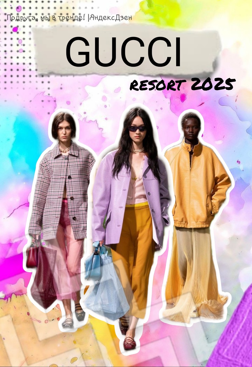 Приветствую друзья! Проведу для вас обзор и разбор показов ведущих домов моды и брендов! GUCCI коллекция resort 2025. Коллекция обладает в большей степени свободными фасонами, легкими тканями. Из цветов явно можно выделить пастельные цвета, коричневый и черный. Итак, подробнее... 1. Цветы в принте. Ромашки. Цветочные мотивы и в принте и в декоре есть в коллекции Zimmermann. Но у GUCCI принт более графичный и контрастный. У Zimmermann скорее цветовой тон, гамма, а не контраст. 2. Банты. И на цветовом контрасте и в цвет. С длинными свободными краями и длинными петлями. 3. Прозрачные ткани. Также есть в коллекции Zimmermann, в том числе в сочетании с более плотными тканями. 4. Кружево. Снова параллель Zimmermann. 5. Легкие платья в пол, с шикарными вырезами. 6. Бомберы в разных тканевых решениях, часто в сочетании с прямой миди юбкой. 7. Бахрома, короткая и длинная. 8. Мини, в том числе шорты 9. Джинса. Джинсы свободные, широкие, уровень пояса ниже пупка. 10. Принт клетка 11. Цвета