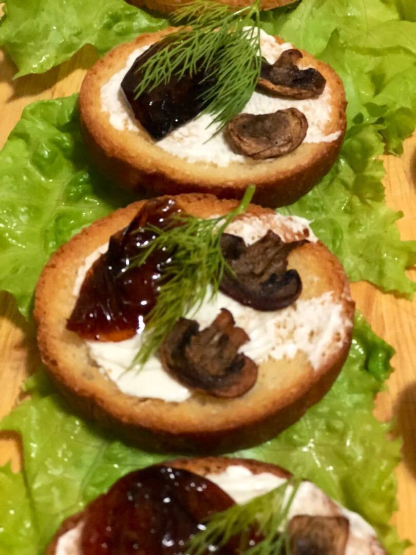#рецептдня#бутерброды#бутербродысвяленымипомидорами# Самый популярный перекус, это бутерброд. Вяленые помидоры, готовила этой осенью, и теперь всегда буду готовить сама, а не покупать в магазинах, вкус отличается. Применяю помидорчики в разные блюда и бутерброды. Сегодня поделюсь очень вкусным и простым перекусом. Итак, начинаю готовить для Вас 👩🏽🍳😋 Ингредиенты: батона, сыра творожного, шампиньоны свежие, вяленых томатов, укропа, листья салата для украшения, чеснока Способ приготовления: Подготовим все ингредиенты и приступаем к приготовлению. Белый хлеб или батон убираем в духовку на 6 минут при t 150° Обжариваем грибочки порезанные на тонкие пластины на растительном масле или можно на масле от помидор. Не забываем посолить и поперчить. Убираем со сковороды для дальнейшего использования При желании можно добавить чесночок, он отлично будет дополнять вкус бутербродов Собираем бутербродики. Листья салата украшают наши бутерброды. Намажем кусочки батона сыром творожным Сверху положи