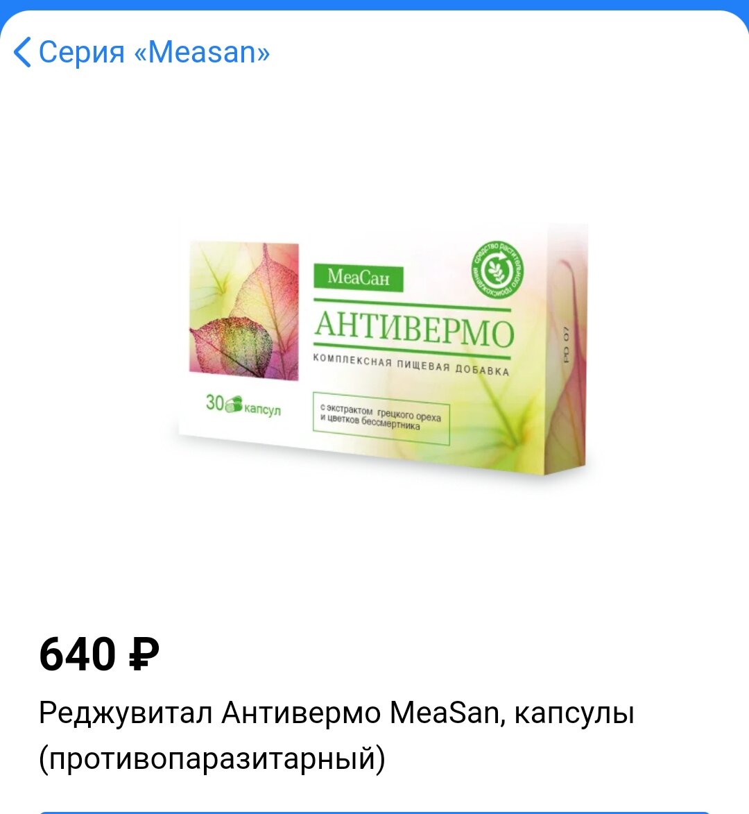 АНТИВЕРМО от паразитов. АНТИВЕРМО МЕАСАН - ЭФФЕКТИВНОЕ ПРИРОДНОЕ СРЕДСТВО ОТ ПАРАЗИТОВ В результате многочисленных исследований, известный доктор Хильда Кларк пришла к выводу, что все хронические болезни человека возникают из - за двух причин: это паразиты и экотоксины. О каком здоровье может идти речь, если в нашем организме спокойно уживаются аскариды, власоглавы, дизентерийные амебы, двуустки кошачьи и прочая гадость. А кожа, это первый орган человека, который показывает, что в нашем организме поселились паразиты - появляется экзема, страшный зуд до крови, различные высыпания и т. д. АНТИВЕРМО капсулы обладает широчайшим спектром действия, убивая более 100 видов паразитов, вирусов, грибков и бактерий. А входящиев состав пептиды, гвоздика и экстракт грецкого ореха убивают личинки и яйца паразитов и как следствие помогает излечиться от многих болезней! Большинству людей, паразиты, живущие в организме никаких неудобств не доставляют. Это симбиоз, который устраивает обоих.