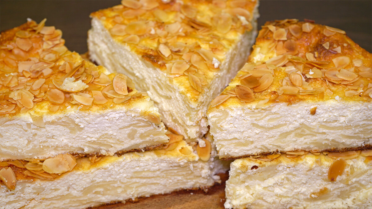 Запеканка/пирог из лаваша с творогом, к чаю, быстро и очень вкусно! Нежная выпечка из творога, с добавлением кокосовых хлопьев! Так запеканку вы еще не готовили! Новый рецепт запеканки из лаваша, которая просто тает во рту. Вкусный пирог из лаваша с творогом, на сметане. Ингредиенты 1. В миску отправляем творог. Разминаем творог вилочкой и добавляем сметану. 2. Отправляем в миску 3 яйца, сахар, ванильный порошок и щепотку соли. Тщательно все перемешиваем. 3. В творожную массу всыпаем 5-6 ст. л. кокосовой стружки (мелких хлопьев). Снова перемешиваем. 4. Мелко нарезаем в миску лаваш с помощью кухонных ножниц. Вмешиваем лаваш в общую массу. 5. Вливаем кефир, перемешиваем и выкладываем творожную массу в форму для выпекания. Посыпаем коричневым сахаром и миндальными лепестками и даем постоять 10-15 минут перед выпеканием. 6. Выпекаем запеканку 20 минут при температуре 190 градусов и еще 10 минут при 200 градусах для того, чтобы она подрумянилась. В сумме 30 минут. Духовки у всех разные, вре