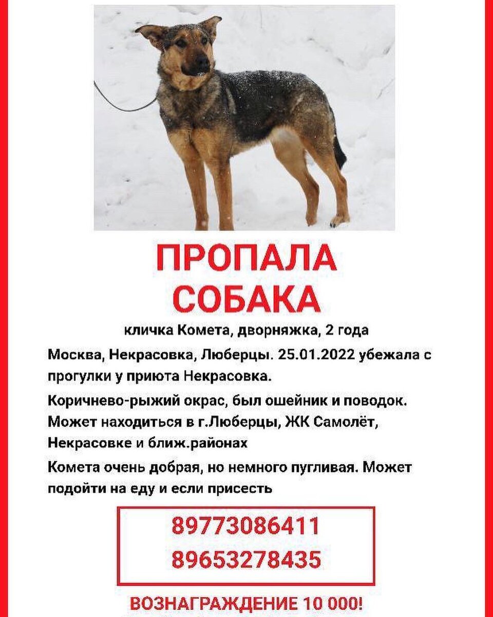 Москва Некрасовка, ЖК Самолёт❗ МО Люберцы Убежала Комета-собака из приюта, улицу не знает. На ней ошейник, возможно обрывок поводка. Комета добрая, социальная собака. Подойдет к людям, если присесть или к маленькой собаке. Звонить в любое время +79629063099 Вознаграждение 10.000❗ #пропаласобака #помогитенайти #потеряласьсобака #япотерялся #убежаласобака #люберцы #некрасовка #потеряшка