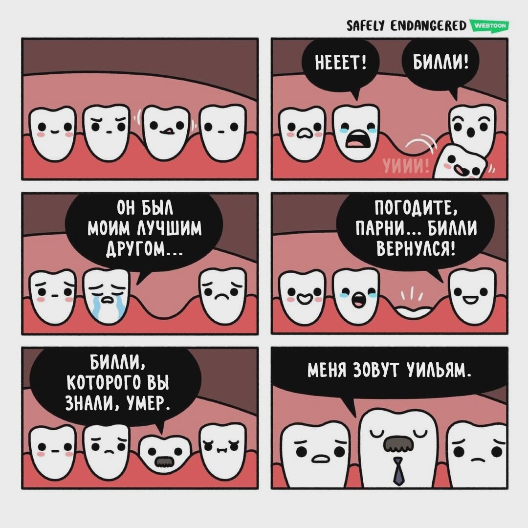 В сети бродит огромное количество шуток про зубы и стоматологов, как минимум, потому что тема это очень жизненная и знакомая любому человеку, который хоть немного заботится о своем здоровье. Конечно же, юмор связанный с зубами в основном крутится вокруг того, какие дорогие нынче услуги стоматологов, но с вашего позволения сегодня я отойду от этой темы (хотя одна подобная шуточка все же будет), а сконцентрируюсь конкретно на самих зубах. У разных авторов я постоянно натыкаюсь на комиксы, где зубы становятся главными героями или на сюжеты, в которых люди делятся своими страхами по поводу зубов. Именно такие зарисовки я и собрал в сегодняшней статье. Надеюсь, что вам понравится. И главное - не забывайте ходить к стоматологам. Начнем мы, пожалуй, с шуток о самых первом наборе зубов, который появляется у человека - речь, конечно же, о молочных зубах. Британский иллюстратор Крис Маккой (Chris McCoy) - автор серии комиксов Safely Endangered («Под угрозой исчезновения») - решил представить, ка