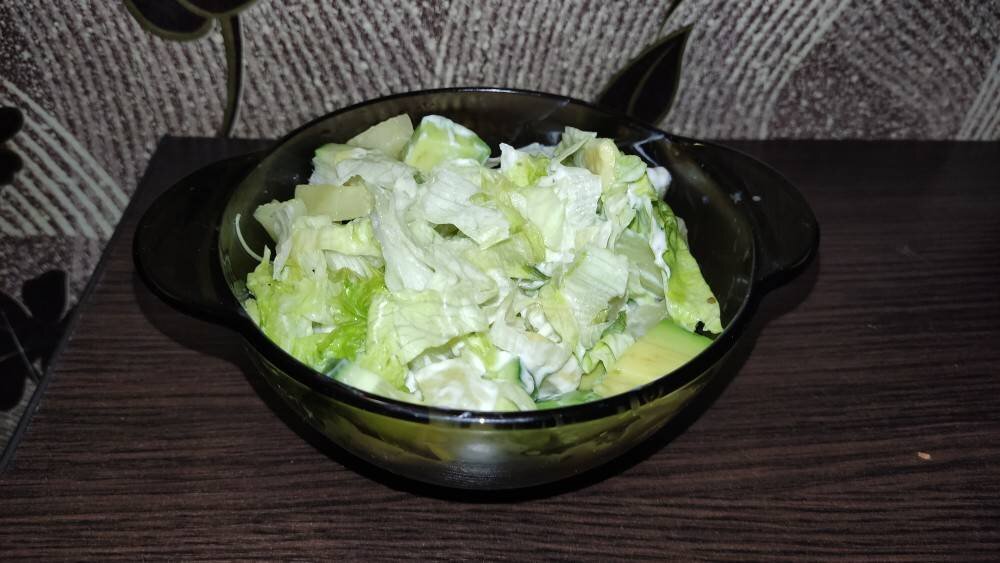 #меню #кукпад4 Вкусный, лёгкий салат с ананасами без креветок и без курицы. На фото ещё должны быть маслины, но не успела запечатлеть их на камеру. Ингредиенты: Салат айсберг, кольца консервированного ананаса, Половинка авокадо, Половинка огурца, Маслины, Соус тар-тар, Соль Способ приготовления: Помыть огурец и салат. Нарезать. Очистить авокадо от кожуры и косточки. Порезать. Измельчить ананас. Добавить в салат. Посолить.Заправить соусом тар-тар. Украсить салат оливками и подавать. Можно посыпать чиа или кунжутом. К сожалению, с оливками сфотографировать не успела. При желании добавьте жаренный арахис. Приятного аппетита!