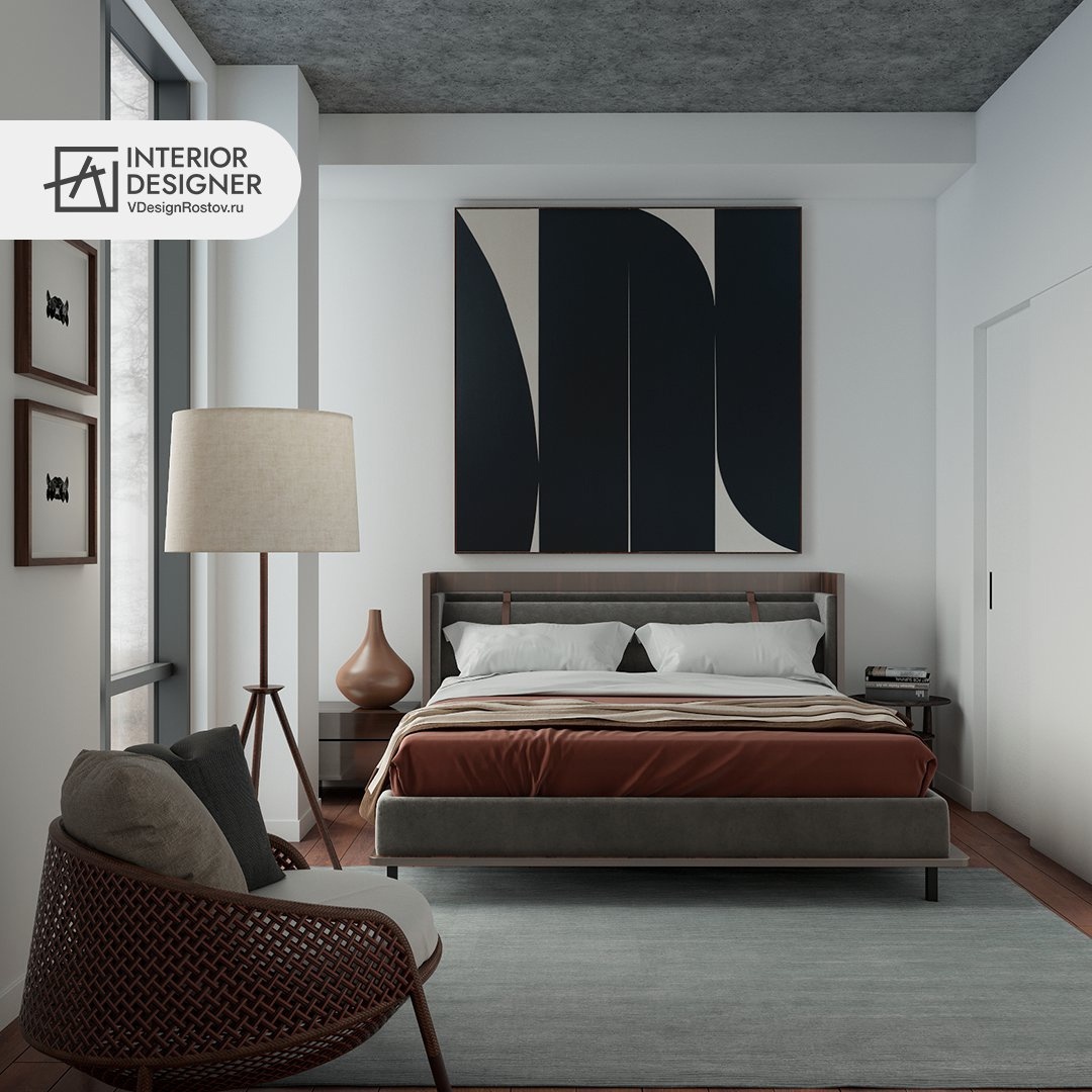 Но акцентный цвет в этой спальне не серый, а глубокий каштановый. Убери его и пространство заметно потускнеет. Как вам такой дизайн спальни?
